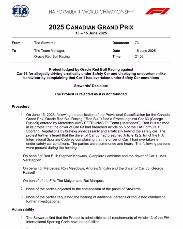 Mercedes defendió su postura, y la protesta de Red Bull fue finalmente rechazada. Mercedes explicó que frenar detrás del coche de seguridad es una táctica habitual para mantener la temperatura adecuada, y argumentó que Verstappen debió anticipar las maniobras de Russell.