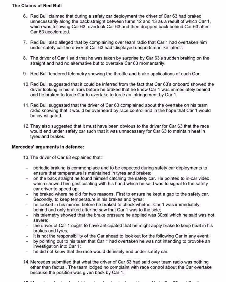 Explicando su decisión de desestimar la protesta, los comisarios declararon: “Aceptamos la explicación del piloto del coche 63 [Russell] sobre el incidente y estamos convencidos de que no condujo de forma errática al frenar donde lo hizo ni en la intensidad con la que lo hizo.”