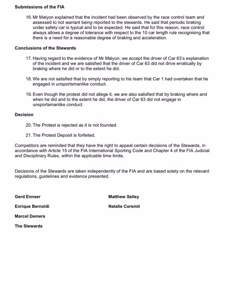 Los comisarios concluyeron que simplemente informar a su equipo que el coche 1 lo había adelantado no constituía una conducta antideportiva. Además, aunque no formaba parte de la protesta, determinaron que el piloto del coche 63 no actuó de forma indebida al frenar cuando y donde lo hizo.